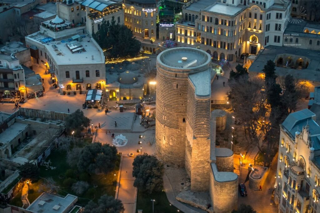 باكو:- هي لؤلؤة بحر قزوين وهي قلب أذربيجان النابض حيث انها مدينة عصرية وفي نفس الوقت محتفظة بروحها التاريخية
